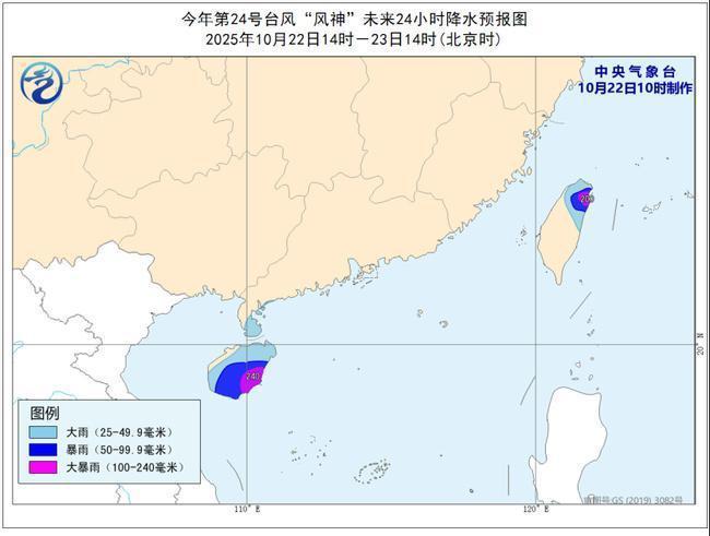降水预报:22日14时至23日14时,海南岛、台湾岛北部、广东雷州半岛等地有大到暴雨,其中海南岛东南部、台湾岛北部等地部分地区有大暴雨(100-240毫米)。